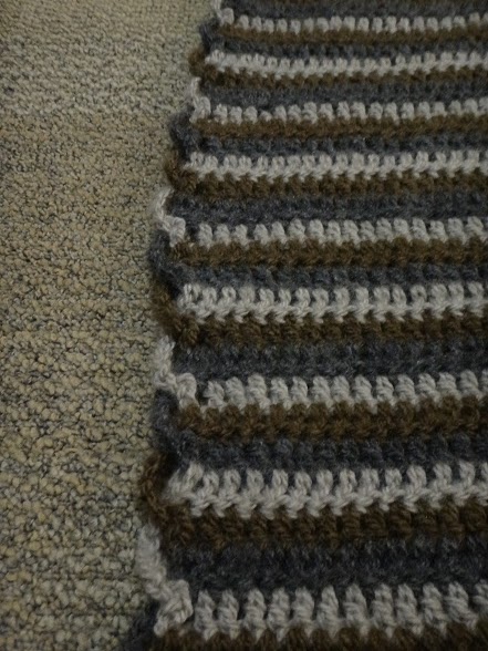 It was like a mini-Christmas! I gave Nate his early Christmas present, a hand-made blanket from a Loops and Threads yarn label. I've been using it since it was finished, and it's kept me warm fairly well. Now he has it, and I gave it to him knowing it would keep him warm like it kept me warm. That's a comfort of mine. Knowing that something I made is keeping him warm when I can't. That's funny for me to say, because